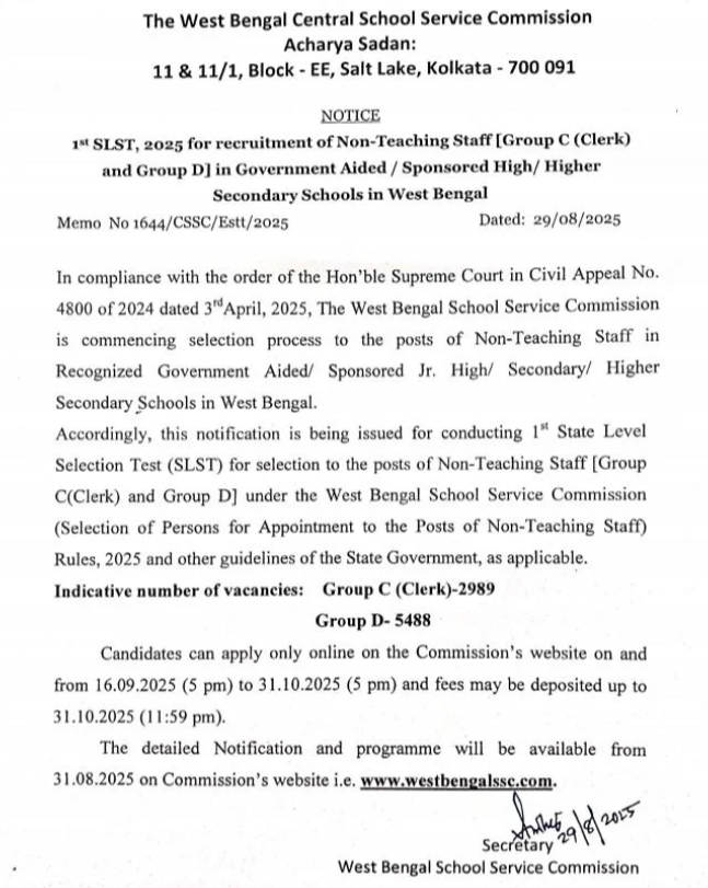 West Bengal School Service Commission (WBSSC) : has formally published a brief notice for the WBSSC Non-Teaching Recruitment 2025. This large recruitment campaign will fill 8477 Group C (Clerk) and Group D (Peon, Laboratory Attendant, Night Guard, etc. ) jobs in West Bengal’s government schools. The detailed WBSSC Non-Teaching Notification 2025, which includes complete eligibility requirements, application dates, charge information, syllabus, and selection process, will be released on August 31, 2025, at the official website wbssc. gov. in.